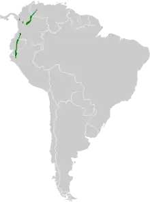 The glowing puffleg inhabits a variety of fairly open landscapes. The edges of cloudforest and elfin forest predominate. It also occurs on brushy slopes, overgrown pastures, and páramo and occasionally in denser subtropical forest. In elevation it ranges between 2,300 and 4,200 m (7,500 and 13,800 ft) but mostly occurs between 2,800 and 3,500 m (9,200 and 11,500 ft).[6]