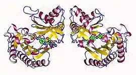 - ↑ Kohls D, Sulea T, Purisima EO, MacKenzie RE, Vrielink A (January 2000). "The crystal structure of the formiminotransferase domain of formiminotransferase-cyclodeaminase: implications for substrate channeling in a bifunctional enzyme". Structure. 8 (1): 35–46. doi:10.1016/S0969-2126(00)00078-2. PMID 10673422.
