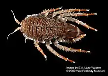 Glyptonotus antarcticus has a typical maximum length of 9 cm (3.5 in),[2] but may rarely reach up to 20 cm (8 in).[3][4] This is large for an isopod, most of which are between 0.5 and 1.5 cm (0.2–0.6 in) in length.[5] It has two pairs of compound eyes, a large pair on the dorsal surface and a smaller pair on the ventral surface. Glyptonotus antarcticus has only five ommatidia, which is unusual for crustaceans and insects.[6] It is thought that the latter are useful when the animal is swimming, which it does in an upside-down position.[6] With the exception of the eyes, certain mouthparts and feet, the whole surface of the animal has minute cuticular outgrowths of feathery hairs and knobbly scales. It is thought that these may help to prevent attachment of Foraminifera and marine larval organisms on the body surface.[7]