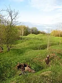 The archaeological site comprises a "citadel" (gorodishche) (Russian: Городище), formerly situated at the confluence of the Rivers Dnieper and Svinets, and a ring of ancient rural settlements (selitba) which occupy an area of 17.5 hectares, of which roughly 5,000 square metres (54,000 sq ft) had been excavated by the end of the 20th century. This makes the site one of the largest survivals of the Viking Age in Europe: only Hedeby covered a larger territory (24 hectares), with the sites of Birka (13 hectares), Dublin (12 hectares), Ribe (10 hectares), and Gdańsk (1 hectare) trailing behind.[1] There are about 3,000 burial mounds[2] arranged in eight clusters of kurgans. Of these, about 1,300 mounds have been explored by Russian and Soviet archaeologists, starting in 1874.