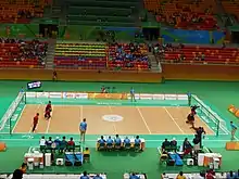 Men's goalball match of China (left) vs United States (right) at the 2016 Summer Paralympics in Rio de Janeiro, Brazil.