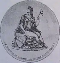In a letter dated August 1, 1835, Patterson proposed that Sully create a Seated Liberty figure for the obverse, suggesting that the "figure be in a sitting posture—sitting, for example, on a rock."[8] Patterson also suggested that the seated figure should hold in her right hand a pileus atop a liberty pole to be "emblematic of Liberty".[8] Numismatic historian Don Taxay notes the similarity between Patterson's Seated Liberty concept and designs already in use on British copper coinage: "Liberty thus emerged as a refurbished Britannia, her trident replaced by a staff and pileus."[7] In the same letter, Patterson also informed Sully of his vision for the reverse, which Peale would execute: "I propose an Eagle flying, and rising in flight, amidst a constellation, irregularly dispersed, of 24 stars [representing the number of states then forming the Union], and carrying in its claws a scroll with the words E PLURIBUS UNUM".[6] Patterson preferred a soaring eagle because he believed that the heraldic eagle commonly used on American coins, which he dismissed as a "mere creature of imagination",[6] was unappealing as a design. According to a common story, the flying eagle seen on the Gobrecht dollar was modeled after Peter, the Mint's pet eagle, who was taxidermied after his death by becoming caught in a coining press and remains on display at the Mint to this day.[9]