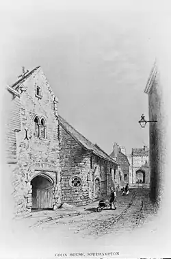 The Hospice, or Hospital of God's House – Domus Dei or Maison Dieu – was founded in the latter half of the 12th century by Gervase (or Gervaise) le Riche, burgess and portreeve (port warden) of Southampton.[5] In the Norman or Mediaeval Latin of that period, he is named Praepositus de Sudhanton. Gervase le Riche had one brother, Roger (possibly a twin), who was the first warden of God's House.[6] The reasons for le Riche's decision to found the hospital are not known. John Leland reported that the hospital was founded on the site of the founder's home. As port warden, le Riche would be likely to live near the port; his house would have opened directly onto the harbour, at a time when there was no wall running along Winkle Street from the Water Gate to God's House Gateway. He would step out of his house, through the wicket-gate, at once upon a pier or quay, against which the waters lapped at high tide, and where the official vessel awaited him for embarkation. Behind, and at the side of his house, along the present High Street, and up to Gloucester Square, stretched the garden and orchards. Nearby, at the other side, lay the Bowling Green.[7]