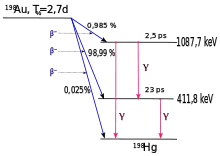 Gold-198 (198Au) is a radioactive isotope of gold. It undergoes beta decay to stable 198Hg with a half-life of 2.69464 days.