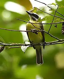 The golden-bellied flycatcher is 20 cm long, weighs 41g and has a black bill. Its crown is grey with a concealed yellow patch, and it has a black eyemask. The upperparts are dark olive, and the wings and tail are brown with faint rufous fringes. The underparts are yellow and the throat is white with dark stripes down each side which distinguish it from similar species like social or gray-capped flycatchers. Young birds have paler yellow underparts, browner upperparts, no crown stripe, and more obvious chestnut fringes to the wing and tail feathers.