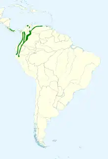 This species is found in the canopy and at the edges of wet, epiphyte-draped mountain forests, especially near streams or clearings. It occurs at middle elevations, typically between 700 and 1850 m altitude, locally to 2300 m in the south of its restricted range.