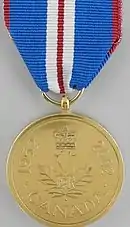 In Canada, the medal was administered by the Chancellery of Honours at Rideau Hall and was awarded to Canadians who made a significant contribution to their fellow citizens, their community, or to Canada over the previous fifty years.[7] Various organisations were invited to propose the names of candidates for the medal; this included all levels of Canadian government, educational and cultural organisations, the Canadian Forces, the Royal Canadian Mounted Police, veterans' groups, sports associations, and philanthropic and charitable bodies.[5] Of the 46,000 medals issued, approximately 9,600 medals were awarded to members of the Canadian Forces according to a system that distributed them proportionately by service (navy, army, air force), rank, and years of service, occupations, and regular force and reservists, including Rangers and honorary appointees.