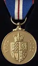 The Queen Elizabeth II Golden Jubilee Medal (French: Médaille du jubilé d'or de la Reine Elizabeth II[4]) or the Queen's Golden Jubilee Medal was a commemorative medal created in 2002 to mark the 50th anniversary of Queen Elizabeth II's accession in 1952. The Queen Elizabeth II Golden Jubilee Medal was awarded in Canada to nominees who contributed to public life. The Queen's Golden Jubilee Medal was awarded to active personnel in the British Armed Forces and Emergency Personnel who had completed 5 years of qualifying service.