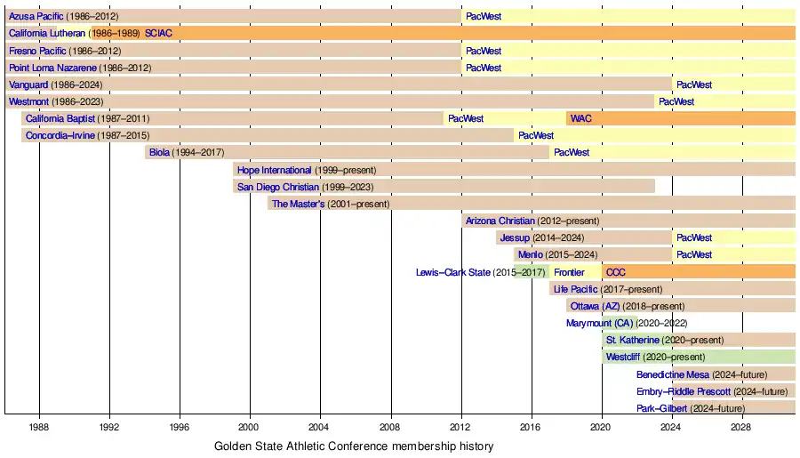 In recent years, the conference has seen changes with members leaving the GSAC and the NAIA for the NCAA. In 2011 Cal Baptist left the GSAC to join the Pacific West Conference followed by the announcement that Azusa Pacific, Fresno Pacific and Point Loma Nazarene joined Cal Baptist in the PacWest in 2012.[1] Concordia then left to join the PacWest in 2015, and Biola applied to make the same move in 2017. To replace these schools, the GSAC has added Arizona Christian, Menlo and William Jessup (now known as Jessup). Life Pacific joined in 2017 and Ottawa (AZ) joined in 2018 to bring the GSAC to 10 members.