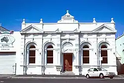 The rear elevation, facing the laneway, has a double gabled parapet.[1]