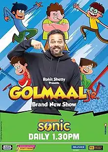 Golmaal Jr. is an Indian animated television series created by Rohit Shetty, based on the comedy film series Golmaal.[1][2] The show is available in Hindi, Bengali, Marathi, Tamil, Malayalam, Gujarati, Telugu and Kannada. It premiered on Nickelodeon Sonic on 13 May 2019 as one of the first originals of Nickelodeon Sonic.