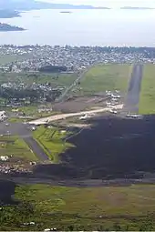 Initially built with a paved 3000 m runway and a large terminal and apron, the airport has not recovered from the 2002 eruption of the volcano Nyiragongo, 14 km to the north. The airport couldn't handle any wide-bodied aircraft except for freight operations run by relief agencies and the United Nations. A stream of fluid lava 200 m by 1000 m wide flowed onto the runway and through the city center as far as the lake shore, covering over the northern 1000 m of the runway and isolating the terminal and apron which were only connected by taxiway to the northern end. The lava can easily be seen in satellite photographs,[2] and aircraft can be seen using the 2000 m southern section of the runway which is clear of lava. A temporary apron was made at the side of the operational part of the runway. A Douglas DC-8 was left stranded on the terminal apron, which is now used by commercial passengers and the military. In December 2012, a contractor began work on cleaning up and fencing in the airport.[3] In February 2017, satellite imagery showed the runway had not yet been repaired where the lava damage occurred.[4] Repairs were started during 2019 and completed by August 2020 according to satellite imagery from Google.