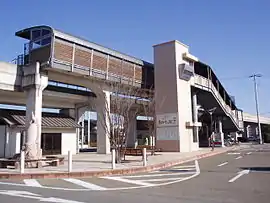 The train station consists of a side platform serving a single elevated track. There is no station building but the platform has a shelter for waiting passengers. In addition, there is a traditional style tiled-roof waiting room set up under the elevated structure. Access to the platform is by means of a flight of steps. Bicycle parking is available under the elevated structure and car parking is available at the station forecourt.[5][6]