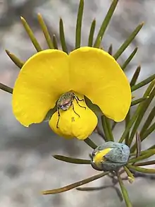 Gompholobium grandiflorum, commonly known as large wedge-pea,[2] is a species of flowering plant in the family Fabaceae and is endemic to eastern New South Wales. It is an erect, more or less glabrous shrub with trifoliate leaves and lemon-yellow and greenish, pea-like flowers.