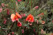 Gompholobium uncinatum, commonly known as red wedge pea,[2] is a species of flowering plant in the family Fabaceae and is endemic to eastern Australia. It is a small, low-lying shrub with trifoliate leaves, the leaflets linear to narrow lance-shaped, and red, or orange-red and yellow-green, pea-like flowers.