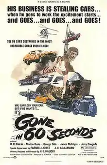 Gone in 60 Seconds is a 1974 American independent action film written, directed, produced by, and starring H. B. Halicki.[2] The film centers on a group of car thieves and the 50 cars they must steal in a matter of days. It is known for having wrecked and destroyed 93 cars in a 40-minute car chase scene, one of the longest in film history. A total of 127 cars were either destroyed or damaged throughout the entirety of the film.[2]
