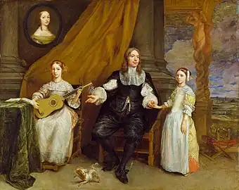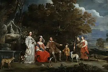 His family portraits are never stereotypes although his clients may have been able to choose from models. This explains that identical poses appear in a series of diverse pictures. Still each background is different.[3] A good example of a family portrait is the composition A family group in a landscape (Wallace Collection). It shows the father of the family decorously holding his wife's hand while pointing with his other hand to his sons returning from the hunt. The image conveys the privileged position of the family members since hunting had been until shortly before the date of the painting the exclusive privilege of the nobility. A daughter accompanies the boys. The basket of fruit she carries may be a representation of the hope for a fruitful marriage.[9] The well-tended garden is decorated with statuary and fountains and is a testimony to the sitters' status and wealth. The family hierarchy is clearly staged, but the setting remains informal because of the presence of children and pets.[3] The background in this painting may have been painted by another hand.[9]