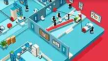 The player controls the son of a CEO of a major megacorporation; their goal is to complete tasks throughout the building to climb the corporate ladder.[1] These goals are common office tasks, such as setting up a projector for a conference meeting.[1] These tasks can be completed in a multitude of ways, although most can be described as either "non-destructive" or "chaotic"; for example, the player could either navigate the projector throughout the rooms, or simply form a slingshot and launch it through the walls instead.[1] Upon completing the task, the player is graded on how long it took to complete the level, as well as the number of objects destroyed and the monetary repair costs for damage; although grades are given for all three of these, the overall grade is generally based around time, so causing costly damage but completing the level quickly will still result in a good overall grade.[2][3] The gameplay is broken up into levels with each level being a different floor that covers a different type of business.[2] Clothing pieces can be found throughout the game that allow the player to customize their character's appearance.[1] The game supports local multiplayer with one other person, allowing for two players to complete the puzzles at one time.[4]