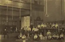 The gymnasium had a floor space 40 by 46 feet (12 m × 14 m). The apparatus was so arranged that it could be easily removed to change the gymnasium into an audience room with a seating capacity of about 300. A stage and two dressing rooms provided for entertainments.[4]