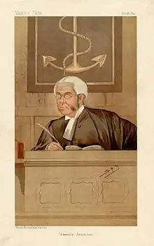 He was well known as an expert in Admiralty cases, and in 1892 was made a Judge of the Probate, Divorce and Admiralty Division of the High Court of Justice, where he acted as president during the illness of Sir Francis Jeune in late 1902.[3] When Jeune retired in 1905, Gorell was appointed president of the division from 1905 until 1909. He was admitted to the Privy Council in 1905 and in 1909 he was raised to the peerage as Baron Gorell, of Brampton in the County of Derby. He died in April 1913, aged 64, and was succeeded in the barony by his eldest son Henry Gorell Barnes.[2]