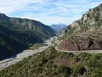 South from Guillaumes, the D902/D2202 runs on the west side of the gorge, with the southbound lane going through 17 tunnels.[10] The (now defunct) Alpes-Maritimes railroad line from Pont-de-Gueydan to Guillaumes, inaugurated in 1923, runs east from Guillaumes and crosses the gorge at the Pont de la Mariée, spanning 58 meters. Bungee jumping is done from the 80-meter-high bridge.[2][10] Other notable sights include the Tête de la Femme, a rock formation resembling a woman's head on the west side of the road, just north of the Pont de Berthéou,[2] and the gorge is a popular destination for rafting[11] and canoeing.[12] The road along the gorge lends itself to motorcycle[13] and bicycle tourism.[14]