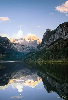 Gosauseen are three lakes in the south-western, Alpine part of Upper Austria. They are situated near the town of Gosau, which is close to Salzburg. The mountains that encircle the lakes are called the Dachstein Mountains, whose glaciers partially shaped the landforms and still influence the hydrology of the area.