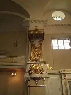Emipire style is represented in the combination of white and gold leaves in many of the interior fittings, the glazed episcopal bench that is used today to chat to visitors and the clergy, the wall clock and the stands. Also in empire style is the pulpit, designed by the architect Axel Magnus Fahlcrantz.