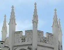 Ornate crocketted pinnacles adorn the roof of the tower.