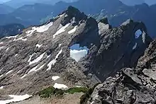 Gothic Peak is a 6,213-foot (1,894-metre) multi-peak mountain summit located near the western edge of the North Cascades Range, in Snohomish County of Washington state. It is located south of Barlow Pass along the Mountain Loop Highway near the Monte Cristo area. It is situated on land administered by the Mount Baker-Snoqualmie National Forest. The mountain was named for early prospector William Gothic, who was one of the first to stake a claim in Gothic Basin.[3][4] The mountain's name was officially adopted in 1967.[2] The nearest higher peak is Del Campo Peak, 0.5 miles (0.80 km) to the northeast, and Foggy Pass is the low point between the two peaks.[1] Foggy Lake lies in Gothic Basin below the east face of Gothic Peak and collects precipitation runoff which ultimately drains to South Fork Sauk River via Weden Creek. Runoff from the west side of the mountain drains into the Sultan River. The first ascent of the mountain was made on June 10, 1934, by Don Blair, Willard Carr, Norval Grigg, and Art Winder. In terms of catching favorable weather, the best months for climbing are July through September.
