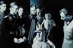 One of the best known paintings of Helnwein's oeuvre is Epiphany I – Adoration of the Magi, (1996, oil and acrylic on canvas, 210 cm x 333 cm, collection of the Denver Art Museum).[53] It is part of a series of three paintings: Epiphany I, Epiphany II (Adoration of the Shepherds), Epiphany III (Presentation at the Temple), created between 1996 and 1998. In Epiphany I, SS officers surround a mother and child group. To judge by their looks and gestures, they appear to be interested in details such as head, face, back and genitals. The arrangement of the figures clearly relates to motive and iconography of the adoration of the three Magi, such as were common especially in the German, Italian and Dutch 15th century artworks. Julia Pascal wrote about this work in the New Statesman: "This Austrian Catholic Nativity scene has no Magi bearing gifts. Madonna and child are encircled by five respectful Waffen SS officers palpably in awe of the idealised, blonde Virgin. The Christ toddler, who stands on Mary's lap, stares defiantly out of the canvas." Helnwein's baby Jesus is often considered to represent Adolf Hitler.[54]