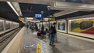 The station's west wall featured a mural of Bishop Vital-Justin Grandin, the first Catholic bishop in Alberta. It was designed by artist Sylvie Nadeau, and it was donated by the Francophone jeunesse de l'Alberta.[8] After criticism from local First Nations activists that the Nadeau mural could be interpreted as celebratory of the Indian residential schools system, local artist Aaron Paquette was commissioned to create a second "response" mural from a First Nations cultural perspective.[9] Following a decision by Edmonton City Council in June 2021, the mural of Grandin was covered.[5]