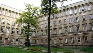This monumental building was erected in 1870–1878 by architects Feliks Księżarski and Sylwester Hawryszkiewicz. During the First World War, it housed the headquarters of the 8th Russian Army.[1] In the interwar period, the Polish Voivodship Administration was located here, during the Nazi occupation — administration of the Governor of the Halychyna District. On April 28, 1943, the edifice witnessed an official ceremony of the inauguration of SS Division Galicia that was attended by representatives of the authorities, the National Socialist Party, the German army, former soldiers of the Ukrainian Galician Army, the press; well-known Ukrainian statesmen Viktor Kurmanovych and Volodymyr Kubiyovych were present too.[2]
