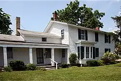 The Barry House is a two-story, white-painted wood frame structure with a solid stone foundation, measuring approximately 24 feet by 76 feet. The windows are double-hung six over six lights with green shutters. The entry door has sidelights and opens into a large hall. There are seven rooms on the first floor, including two large parlors, and five rooms on the second floor.[3]