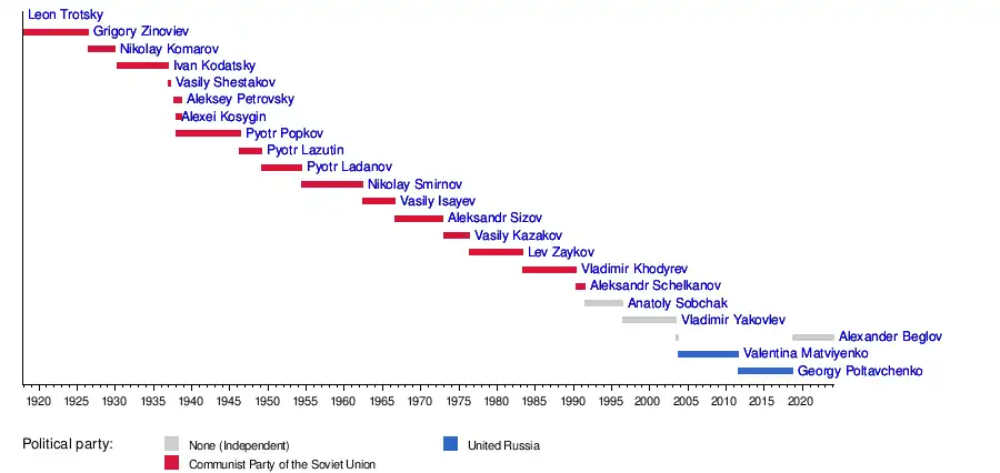 Alexander BeglovGeorgy PoltavchenkoValentina MatviyenkoVladimir YakovlevAnatoly SobchakLev ZaykovVasily KazakovNikolay SmirnovAlexei KosyginIvan KodatskyNikolay KomarovGrigory ZinovievLeon Trotsky