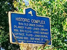 The Grace Church Complex, saw its 175th anniversary in 2019, is a historic Episcopal church complex in Massapequa, Nassau County, New York. The complex consists of the church, surrounding parish cemetery, the Floyd-Jones family cemetery, and the DeLancey Floyd-Jones Free Library. The small church was built in 1844 by Elbert Floyd-Jones and remodeled in 1905. It is a frame structure on a brick foundation and consists of a vestibule, nave, and chancel. It is in the Gothic Revival style and features a square bell tower with modest spire. The church also has Tiffany glass windows added during the remodeling.[2] Sometime after 1983, the old Grace Church was given to the Historical Society of the Massapequas.