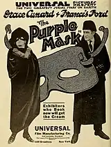 Cunard and Ford continued their collaboration throughout 1914, releasing an array of two-reel historical dramas, Westerns, comedies, and mysteries. A few examples from that year are The Mad Hermit, The Fall of '64, Won in the First, The Mysterious Leopard Lady, and Washington at Valley Forge. Turning to a more ambitious project, they developed for Universal in 1914 and also co-starred in the 15-episode serial Lucille Love, Girl of Mystery. That production's enormous success is reflected in the box-office receipts it generated. Costing only $30,000 or $2,000 per episode to make, the Lucille Love series eventually grossed what was then a staggering return in ticket sales: $1,500,000 ($43,820,000 today).[15] The financial success of Lucille Love inspired the Ford-Cunard partnership to release between their ongoing shorts three more serials for Universal over the next two years: the 22-episode The Broken Coin (1915), the 15-episode The Adventures of Peg o' the Ring (1916), and the 16-episode The Purple Mask (1916-1917).[16]