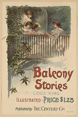 One reason King began writing and publishing was her desire to be financially independent from her brothers. After the publication of "Monsieur Motte," King began writing short stories for Harper's Magazine. Many of these stories later appeared in her collections, Tales of a Time and Place. King also wrote and published the novellas "Earthlings" and "The Chevalier Alain de Triton" for literary magazines.[20] In 1893, the Century Company published another collection of King's short stories, Balcony Stories. Balcony Stories represents a shift in King's fictional writing. Her stories become much shorter, including less descriptions and simpler plots.[21] However, the stories still contained King's signature traits. The stories were told from the point of view of women who experienced the loss of social status, money, and family members due to the Civil War and Reconstruction.[22]