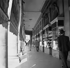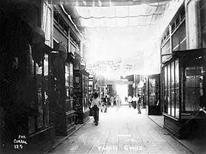 The structure built from 1894 to 1917[10] was the first European-style shopping arcade in Cuba. In certain respects, it recalled the Covered passages of Paris,[lower-alpha 4] The Covered Passage of Paris (French: Passages couverts de Paris) are an early form of shopping arcade built in Paris, France primarily during the first half of the 19th century. By the 1850s there were approximately 150 covered passages in Paris but this decreased greatly as a result of Haussmann's renovation of Paris. Only a couple of dozen passages remain in the 21st century, all on the Right Bank. The common characteristics of the covered passages are that they are: pedestrianized; glass-ceilings; artificially illuminated at night (initially with gas lamps); privately owned; highly ornamented and decorated; lined with small shops on the ground floor; connecting two streets. Originally, to keep the passages clean, each would have an artiste de décrottage (a shit-removal artist) at the entrance to clean the shoes of visitors. The Paris passages were the subject of Walter Benjamin's incomplete magnum-opus Passagenwerk (Arcades Project) which was posthumously published.[12]