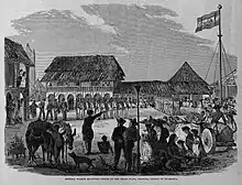 American-born General William Walker reviewing his troops on the Grand Plaza, Granada, capital of Nicaragua. Illustration for Frank Leslie's Illustrated Newspaper, June 21 of 1856.