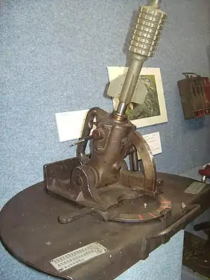 The Granatenwerfer 16 was a type of spigot mortar. Rather than being a muzzle-loaded weapon like a Stokes or Brandt mortar where the projectiles slide down a tube until it hits a firing pin to launch the projectile, the Granatenwerfer had a short metal spigot that was attached to a base that was adjustable for traverse and elevation. The Granatenwerfer 16 had a two-man crew consisting of a gunner and a loader. The projectile was similar in size and construction to a hand grenade with a hollow center tube with tail fins that slid over the spigot. The Granatenwerfer 16 was light enough to be carried across no man's land while other weapons like the 147 kg (324 lb) 7.58 cm Minenwerfer or the 483 kg (1,065 lb) 17 cm mittlerer Minenwerfer were sometimes too heavy to be transported easily across rough ground. The Granatenwerfer 16 could be broken down into two parts with the launcher weighing 24 kg (53 lb) and the baseplate weighing 16 kg (35 lb).[6]