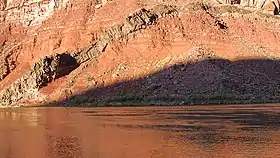In the northeast Grand Canyon, the Tapeats is still the defining cliff unit at the Great Unconformity between the paleozoic Tapeats Sandstone and the basement geology below. However, the entire east of the Kaibab Plateau is an uplifted side of the East Kaibab Monocline.[7] The down-dropped east side of the Kaibab Plateau is defined by the south-flowing Colorado River.