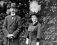 During his visits to Greece, in the family atmosphere of his first cousin Queen Olga of Greece, Grand Duke Paul grew closer with Olga's eldest daughter, Princess Alexandra of Greece and Denmark.[15] Alexandra's father, King George I of Greece, was a brother of Tsarina Maria Feodorovna, Paul's sister-in-law. During the silver wedding anniversary of King George and Queen Olga, Paul asked for Alexandra's hand and he was accepted.[13] Alexandra had come to Russia several times during visits to her maternal relatives. She was lively and mischievous, while he was reserved.[16] Their engagement was announced on 10 November 1888.[16] The wedding took place on 17 June [O.S. 5 June] 1889 in St. Petersburg, at the chapel of the Winter Palace.[13] Grand Duke Paul was 29 years old and his wife ten years younger.[17]
