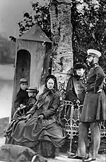 Since childhood, Paul was very attached to his brother Sergei, their closeness remaining even after Sergei's engagement and later marriage to Princess Elisabeth of Hesse and by Rhine (1864–1918).[3] Paul accompanied the couple to England to meet Elisabeth's British grandmother, Queen Victoria, who was favorably impressed by Paul.[3] After Sergei's marriage, Paul moved in with his brother and his new sister-in-law, who also became very close to him.[3] The trio shared the same household for some time, and they made a trip together to Jerusalem in 1888.[12] Grand Duke Paul suffered from weak lungs and spent periods abroad to recuperate.[7] On medical advice, he visited Greece in 1887.[12][13]
