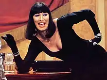 In the 1990 film of The Witches, The Grand High Witch is a tall, mysterious, attractive, snobbish, foreign aristocrat, a glamorously and provocatively[4] dressed femme fatale type with heavily made-up appearance, full of dominating and predatory "vamp" sexuality.[5] Here, she attracts attention of men, including the character of Mr. Jenkins who unsuccessfully flirts with her right in front of his wife (unaware that she has just turned his son into a mouse), and acts in erotic and seductive ways even when tauntingly interacting with children; she is sexually sadistic, even deriving such an excitement and pleasure from hurting children in particular, that she is actually shown as having an orgasmic experience.[2][6][7][8] The other witches fear and adore her, often praising her intelligence. Haughty, cunning, dramatic, impatient, and volatile, she does not care how her commands are carried out, just so long as they are obeyed. She has an assistant named Miss Irvine, who eventually walks out on her after becoming tired of her incompetent behavior, ultimately becoming good. One witch with whom she is shown to be actually friendly with is "the Woman in Black", who attempted to kill Luke earlier in the story and is given a larger role in the film.