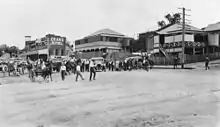 In 1906 the property was formally acquired by the Queensland National Bank as Shaw was declared insolvent in 1904. Moulds died in 1907 and in early 1908 the property, now described as subdivision 1 on section 6 of resubdivision 11 of subdivision B, and measuring about 24 perches (610 m2), was acquired by Lucy Moulds, his widow. The property was purchased in 1917 by Francis Chardon, a butcher, who presumably purchased it as an investment. May Maykin purchased the license from 1920 to 1922.In 1923 a major fire occurred in the block along Morgan Street and the School of Arts was destroyed, probably also removing the series of small shops shown abutting the Grand Hotel in a 1913 photograph. In 1929 the hotel passed to James Hayes, a hotelier. Hayes ran the hotel until his death in an aircraft accident in 1937,[2] but Mrs Hayes and then Charlotte Hayes continued to operate it. The Hayes family acquired the block next to the hotel and in 1949 this and the original subdivision 1 were sold to Richard and Violet McLean, who had been at the Grand since about 1945. In 1989 the hotel passed to Frank (Tapper) and Rose Welsh.[1]