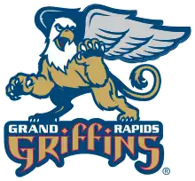 At the announcement of a "name the team" contest in June 1995, DeVos hinted that the group was looking for something "with a face ... with a personality, that we can translate into a mascot of some sort".[4] "Grand Rapids Griffins" was chosen as the winning entry, and the logo and colors of the hockey club were unveiled in November. The logo was designed by Sean Michael Edwards Design, Inc., a New York firm whose portfolio includes logos for the Florida Panthers and Seattle Mariners. In keeping with the traditional theme desired by the club, navy blue and gold were chosen as the primary colors, along with hunter green, red and silver accents. "We didn't want to be trendy in any way", DeVos said.[5]