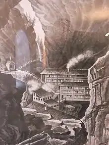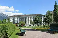 In 1872, the Tamina thermal bath was the first indoor thermal water pool in Europe.[7] The thermal bath is fed with the 36.5 °C thermal water from the nearby Tamina Gorge and consists of the historic Helena pool, a sports pool, a garden pool, a family spa and a sauna area.[15] The water was used in Bad Pfäfers from 1350 to 1969, in the Valens healing clinic and in the thermal baths of Bad Ragaz. The water is used to treat circulatory diseases, rheumatism, symptoms of paralysis and the results from accidents.[16]