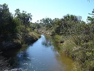 The park contains forests, savannah, cerrado and dense cerrado. There are extensive streams (veredas) which can form oxbow lakes or larger rivers. The terrain contains extensive sandstone plateaus covered in savannah vegetation with lower drainage areas holding the streams. The park contains much of the upper basin of the Carinhanha River and of the sub-basins of its tributaries such as the Itaguari, Mato Grande, Preto and Canabrava.[2]