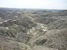 Grasslands National Park represents the Prairie Grasslands natural region, protecting one of the nation's few remaining areas of undisturbed dry mixed-grass/shortgrass prairie grassland.[2] The park is located in the World Wildlife Fund-defined Northern short grasslands ecoregion, which spans much of southern Saskatchewan, southern Alberta, and the northern Great Plains states in the US. The unique landscape and harsh, semi-arid climate provide niches for several adapted plants and animals. The park and surrounding area house the country's only black-tailed prairie dog colonies. Fauna found in the park include bison, pronghorns, greater sage-grouses, ring-necked pheasants, burrowing owls, coyotes, ferruginous hawks, swift foxes, prairie rattlesnakes, black-footed ferrets, eastern yellow-bellied racers, and greater short-horned lizards.[3][4] Flora includes blue grama grass, needlegrass, plains cottonwood and silver sagebrush.[5]