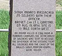 The Grattan Massacre, also known as the Grattan Fight,[1] was the opening engagement of the First Sioux War, fought between the United States Army and Lakota Sioux warriors on August 19, 1854. It occurred east of Fort Laramie, Nebraska Territory, in present-day Goshen County, Wyoming.